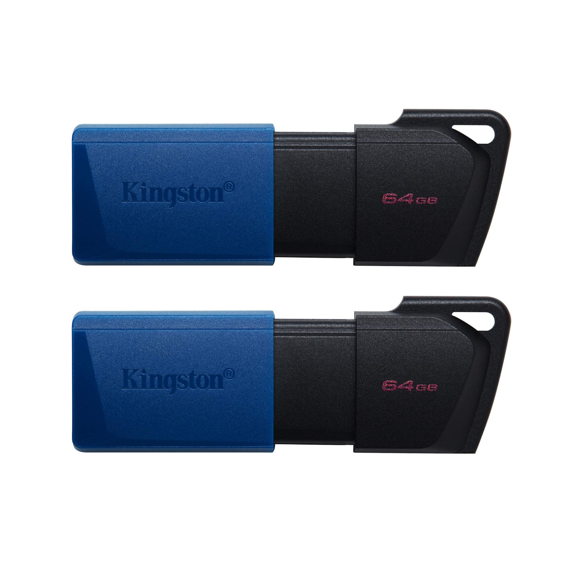 Флэш-накопители Kingston DataTraveler Exodia M 64 GB (USB 3.2 Gen 1, Black + Blue) — комплект из 2 шт. — пара компактных USB-накопителей с интерфейсом USB 3.2 Gen 1 (до ~5 Гбит/с) и общей ёмкостью 64 ГБ каждый, предназначенных для удобного хранения, переноса и обмена файлами между ПК, ноутбуками и другими устройствами с USB-A портом.