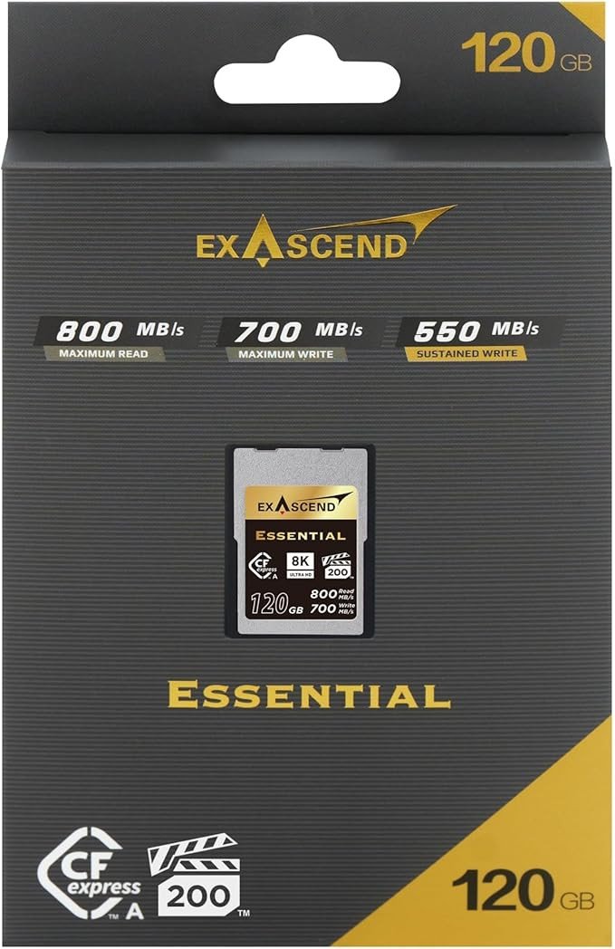 Карта памяти Exascend Essential CFexpress Type A 120 GB — высокопроизводительная CFexpress Type A‑карта с интерфейсом PCIe 3.0/NVMe 1.4, сертифицированная по стандарту VPG200 для записи 8K‑видео и оснащённая флеш‑памятью 3D TLC, обеспечивающей высокую скорость чтения до ≈800 МБ/с и записи до ≈700 МБ/с для профессиональной фото‑ и видеосъёмки без пропуска кадров.