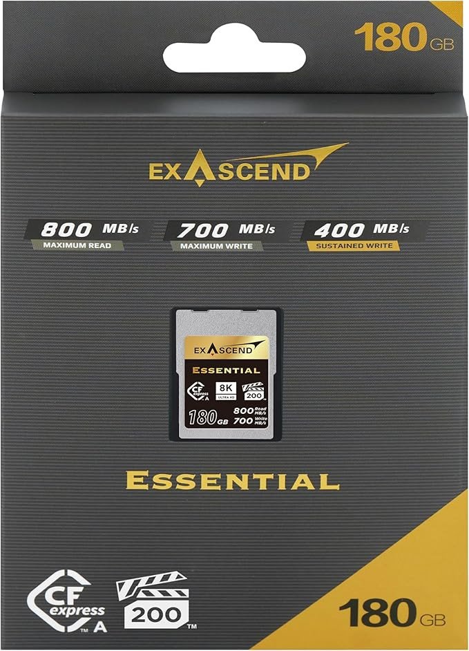 Карта памяти Exascend Essential CFexpress Type A 180 GB — высокопроизводительная CFexpress Type A‑карта с интерфейсом PCIe 3.0/NVMe 1.4, оснащённая 3D TLC флеш‑памятью и сертифицированная по VPG200 для записи 8K‑видео. Объём 180 ГБ, высокая скорость последовательного чтения до ≈800 МБ/с и записи до ≈700 МБ/с делают её подходящей для профессиональной фото‑ и видеосъёмки, включая видео высокой чёткости и быстрые серийные снимки.