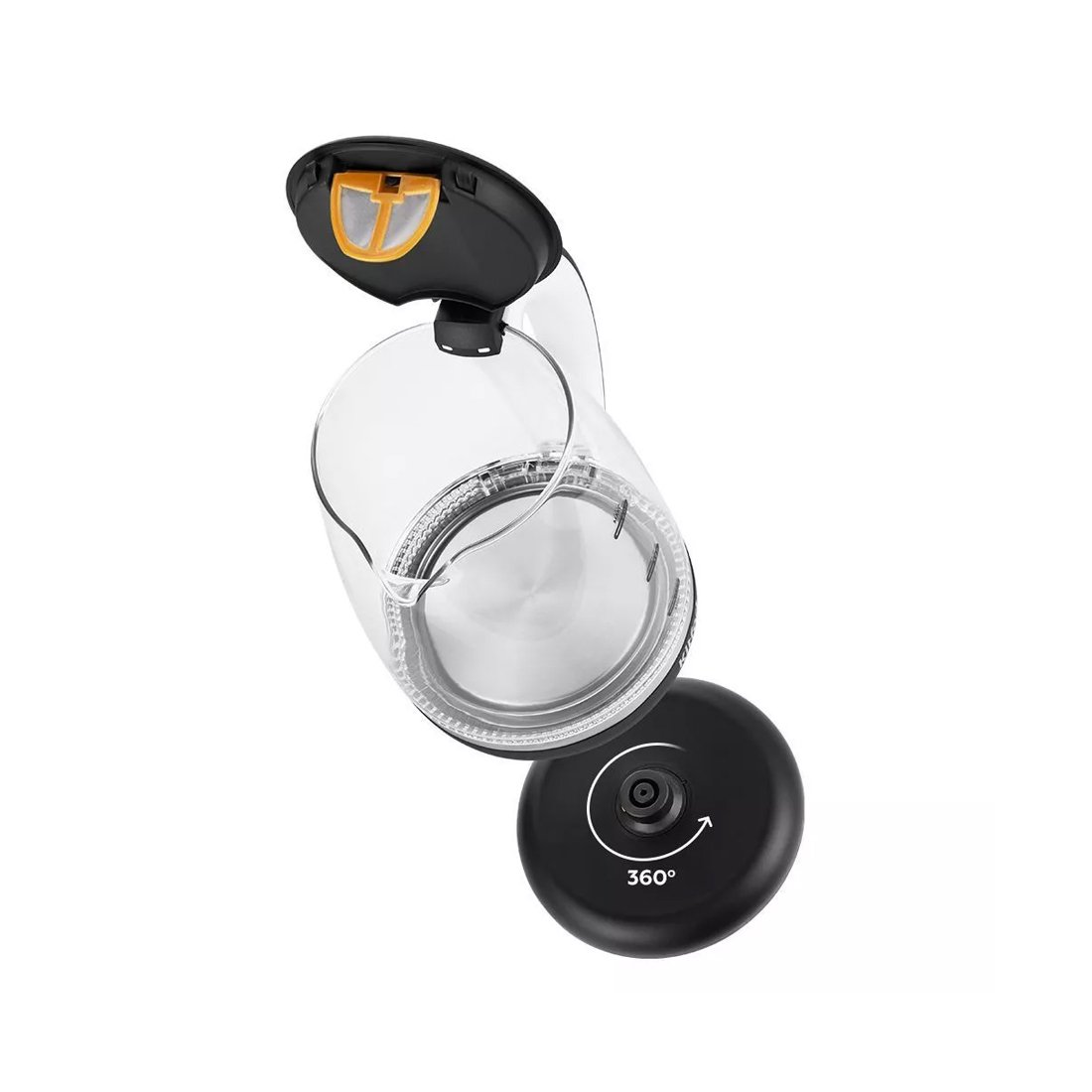 При включении чайника белая подсветка по периметру дна сигнализирует о его рабочем состоянии, а также красиво подсвечивает воду. Подставка с центральным контактом позволяет разместить чайник в любом положении на 360°. Снизу имеется отсек для хранения шнура, в который можно смотать излишки шнура электропитания, чтобы он не мешал на столе.