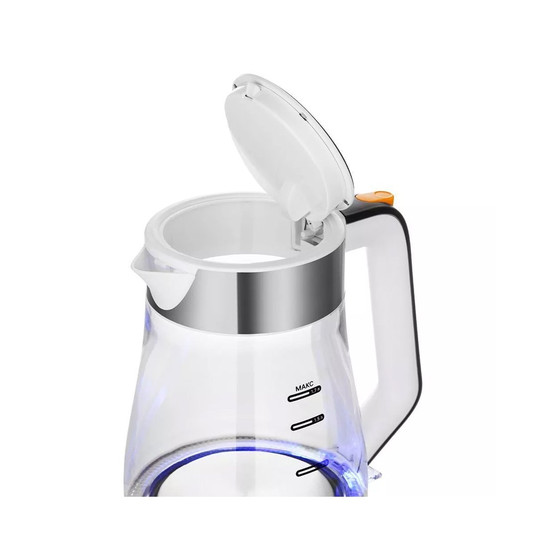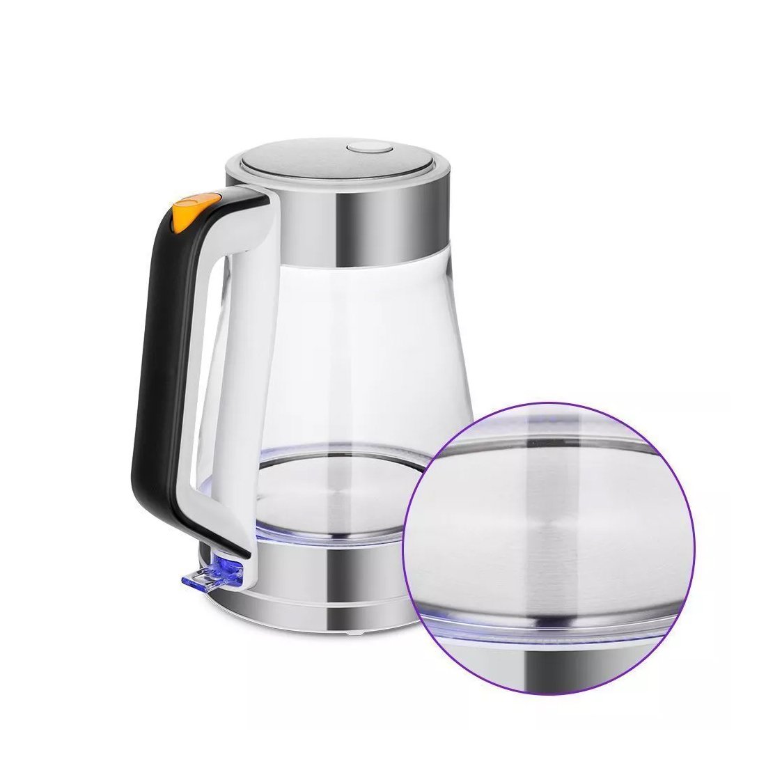 Внутренняя поверхность чайника полностью состоит из металла и стекла, благодаря чему вода не соприкасается с пластиком. Чайник автоматически отключается при закипании, имеет защиту от перегрева и от включения без воды.