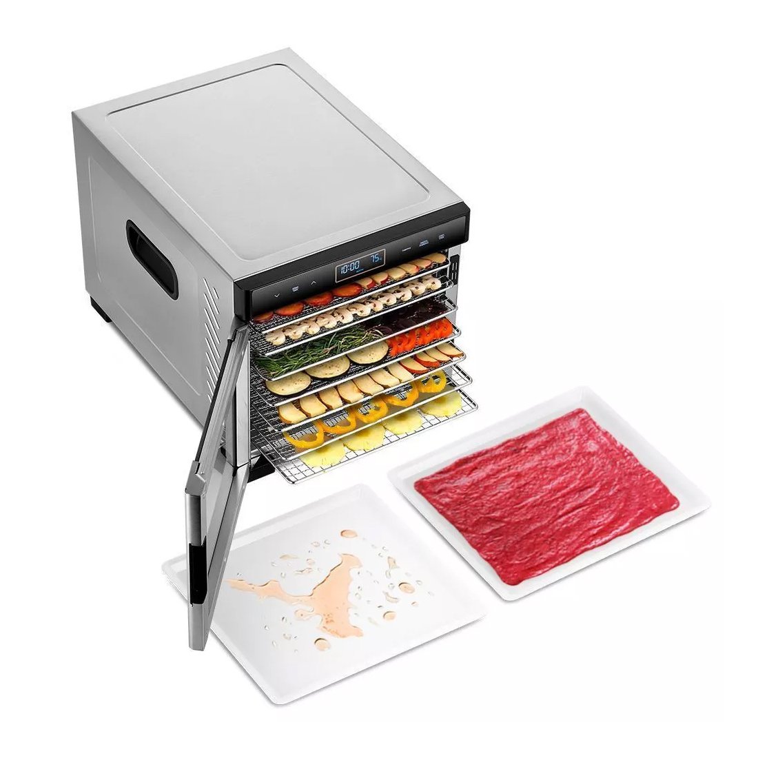 Вмещает в себя 7 поддонов, поэтому за раз может насушить большую порцию полезных и вкусных лакомств.