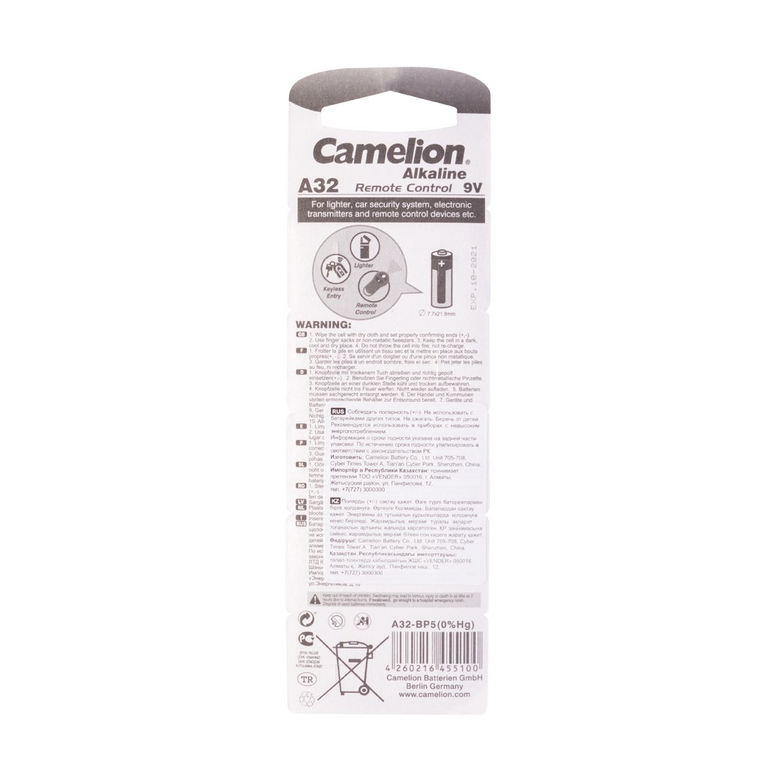Элемент питания – Алкалиновая батарейка Camelion A32-BP5 отличается высоким выходным напряжением и большим сроком службы для приборов и устройств не требующих длительных энергозатрат, таких как пульты управления управления систем сигнализации, ключи от машины, калькуляторы, дверные звонки, цифровые индикаторы веса, материнские платы, электрические игрушки. Имеет прочный корпус, не подверженный коррозии, что исключает протечку батареи во время использования с последующей порчей устройства, работающего с ней.