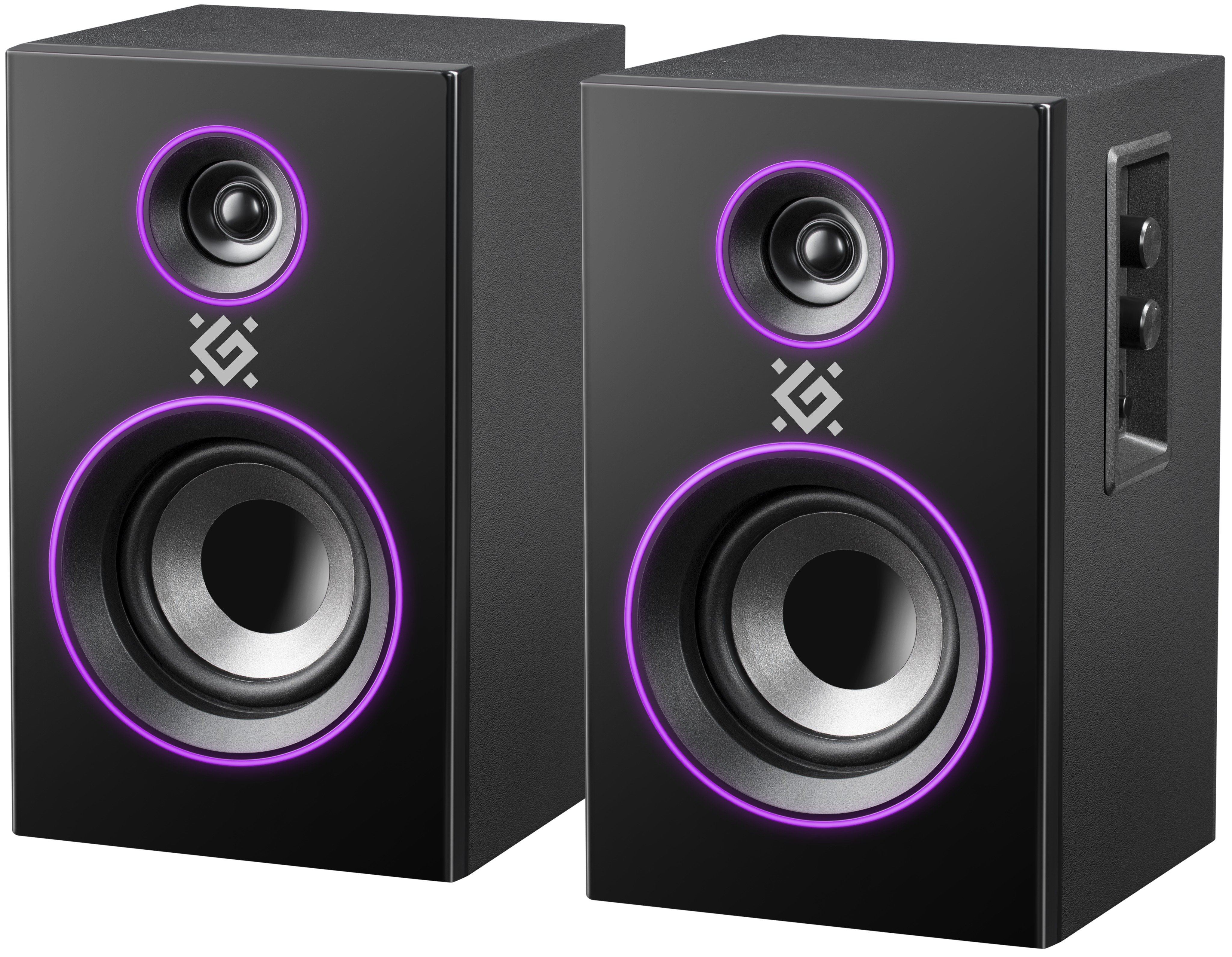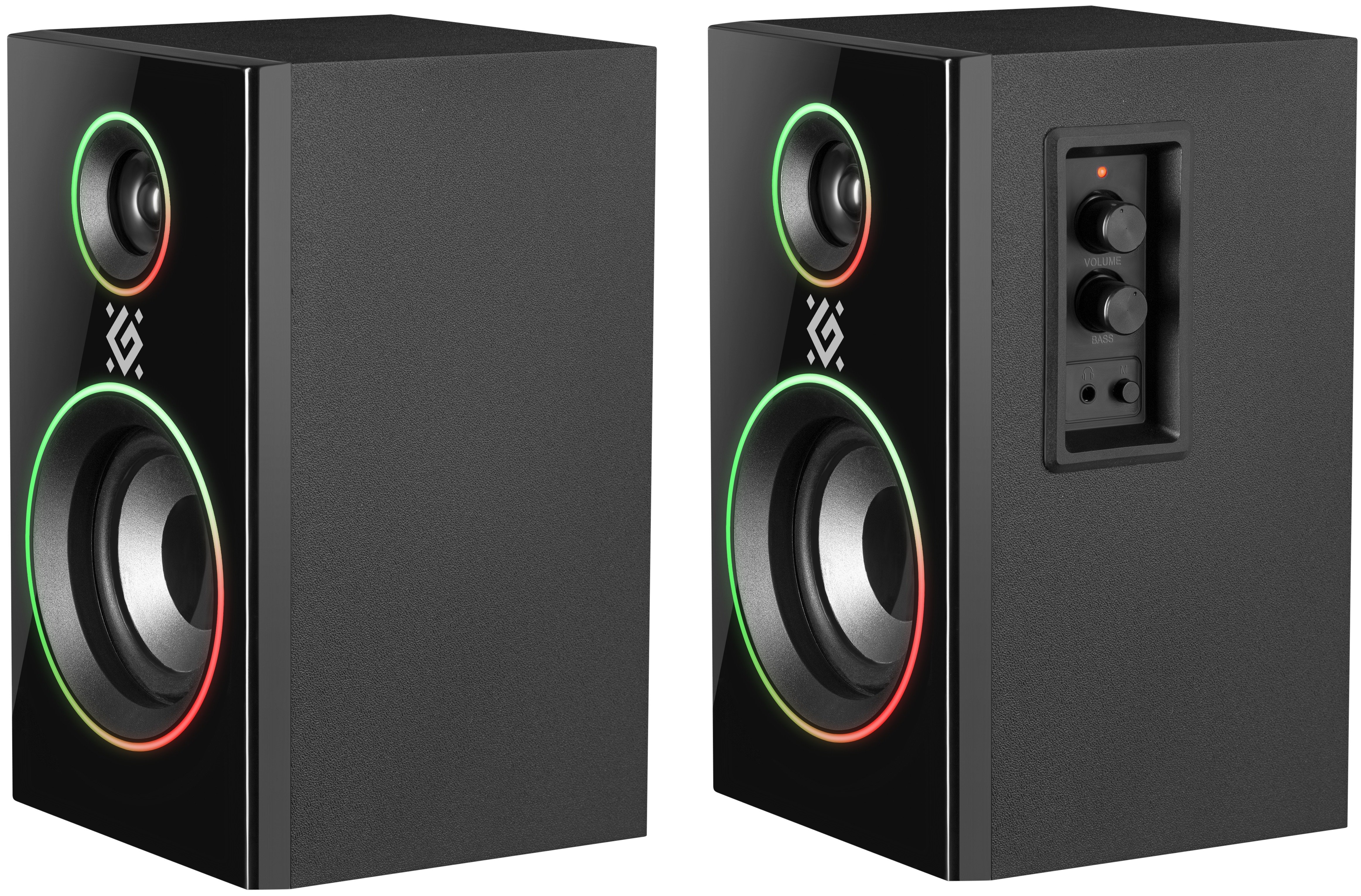 Геймерские компьютерные колонки в деревянном корпусе со светодиодной подсветкой и с функцией Bluetooth. На боковой панели расположен регулятор громкости со встроенным выключателем питания, разъем для подключения наушников, кнопка управления режимами подсветки и переключения AUX/Bluetooth и регулировка тембра низких частот.