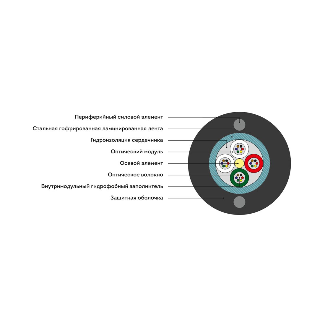 Брони, в качестве которой выступает гофрированная лента из стали. Она защищает волоконно-оптический кабель от разрыва, а также от повреждения грызунами, проживающими в кабельной канализации.