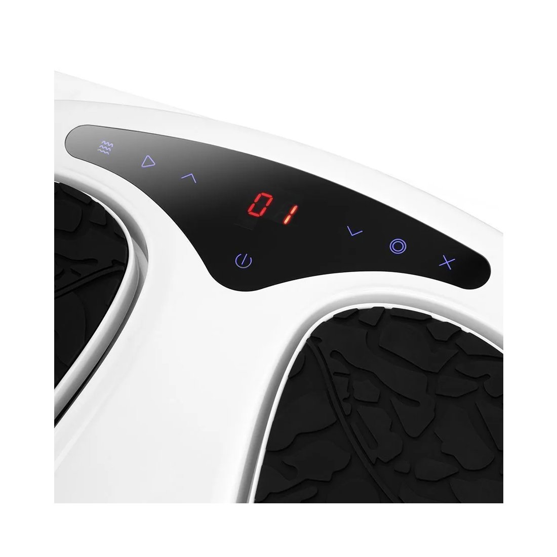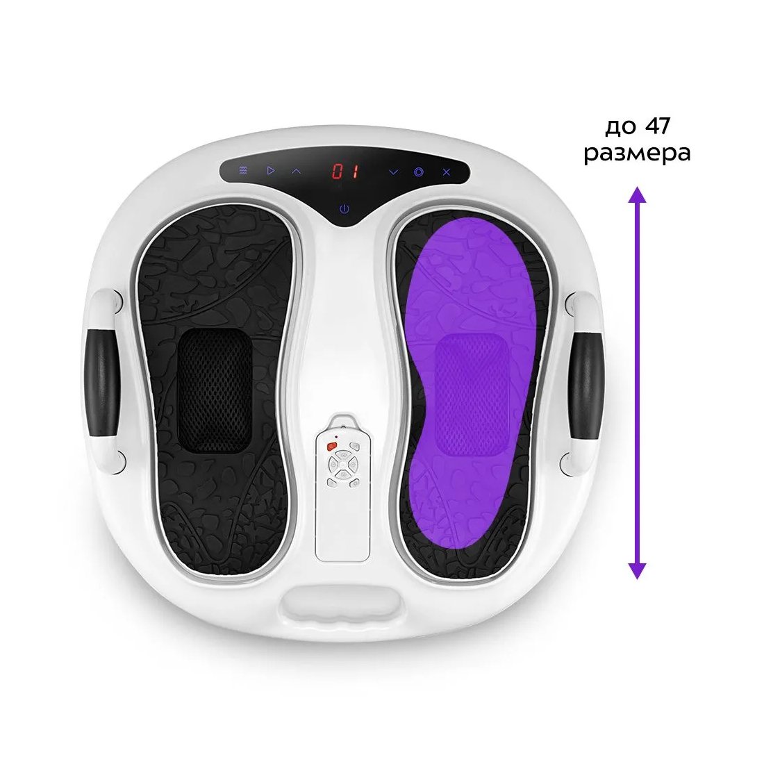 Массажёр для ног выполнен в виде платформы с двумя подкладками. Управление осуществляется с помощью пульта ДУ, работающего от 2 батареек AAA. Нажатия на кнопки сопровождаются звуковым сигналом для удобства использования.