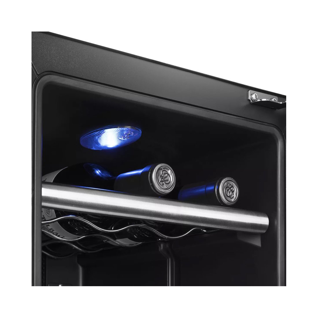 Тонированное стекло двери защищает напитки от ультрафиолетовых лучей, а голубая подсветка поможет определиться с выбором, а также продемонстрировать гостям вашу коллекцию.