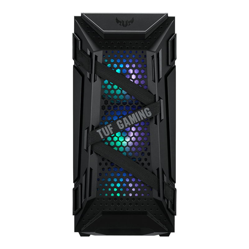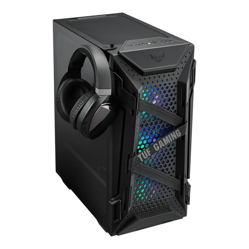Корпус TUF Gaming GT301 отличается агрессивным геймерским дизайном, который акцентируется ячеистой структурой передней и верхней панелей. Данная перфорация служит для облегчения циркуляции воздуха. Корпус оснащен тремя 120-мм адресуемыми вентиляторами Aura Sync с RGB-подсветкой и одним 120-мм задним вентилятором, а также имеет до шести точек крепления вентиляторов для направленного воздушного потока. Имеется возможность добавления водяного охлаждения. С любой стороны корпуса можно прикрепить удобный крючок для гарнитуры.