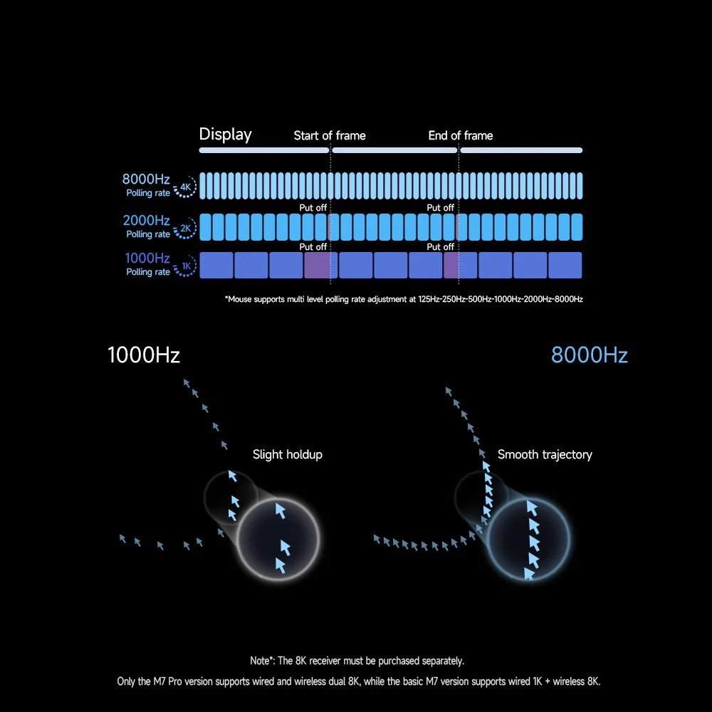 MCHOSE M7 Ultra White — лёгкая многофункциональная беспроводная мышь с оптическим сенсором PAW3950 до 42 000 DPI. Поддерживает подключение по 2.4 GHz, Bluetooth и USB. Частота опроса до 8000 Hz, аккумулятор 500 mAh, 5 кнопок (ресурс 60 млн кликов), вес 55 г. Корпус белого цвета. Подходит для офисного и корпоративного использования.