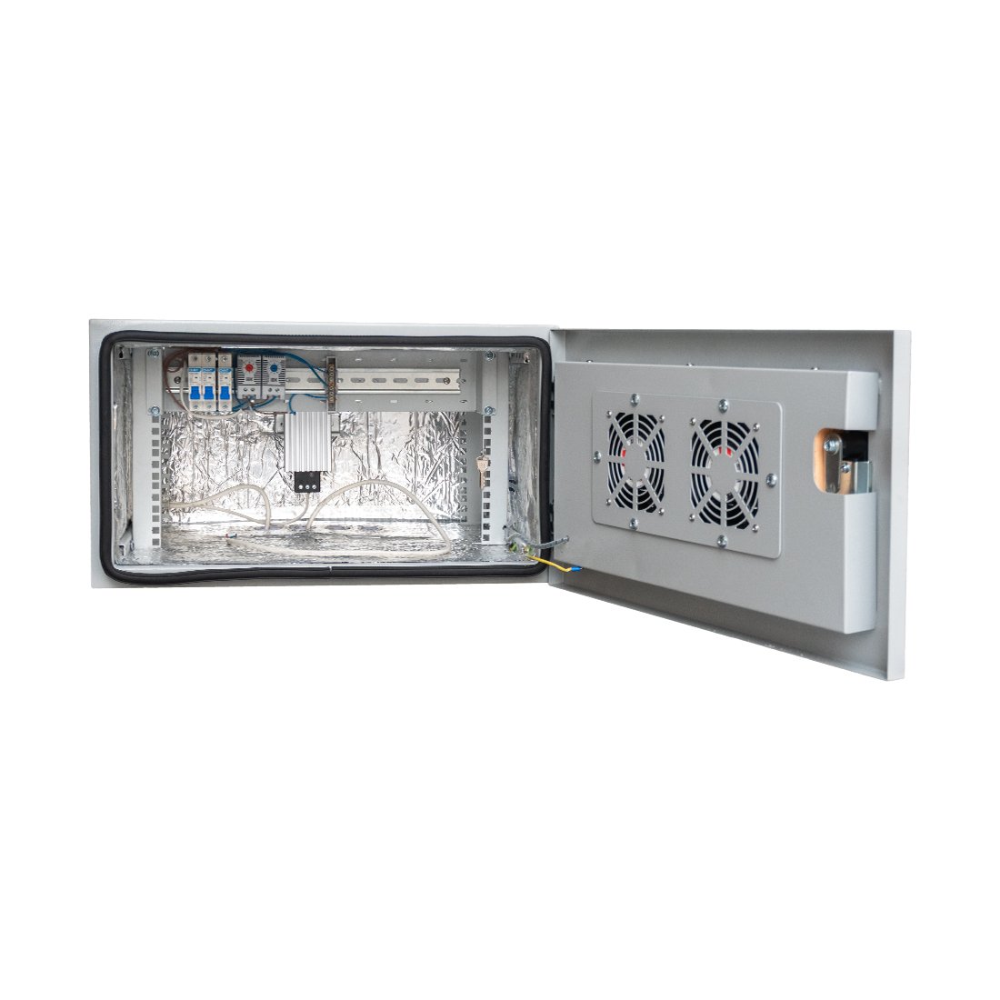 Комплектация - Вентилятор 120мм 220В 2 шт., Обогреватель 100Вт 1 шт., Автомат 16А 3 шт., Термостат NC 1 шт., Термостат NO 1 шт.