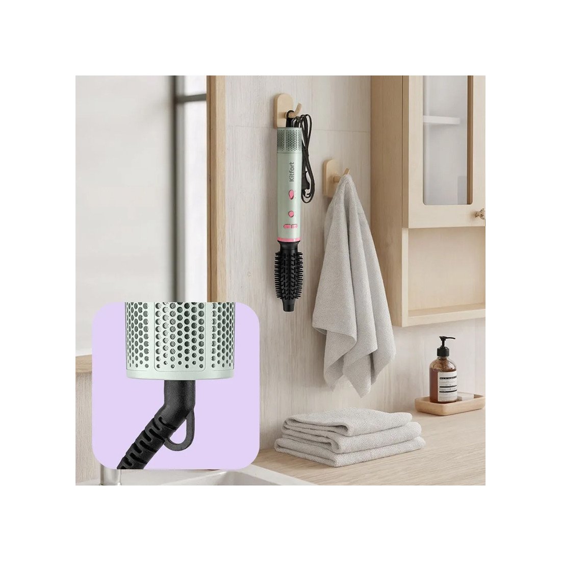 Фен оснащён воздухозаборной решёткой для защиты от попадания пыли и волос в отверстия и мотор фена. Шнур вращается на 360°, что защищает его от перегибов. Благодаря петле, фен можно повесить и хранить таким образом.