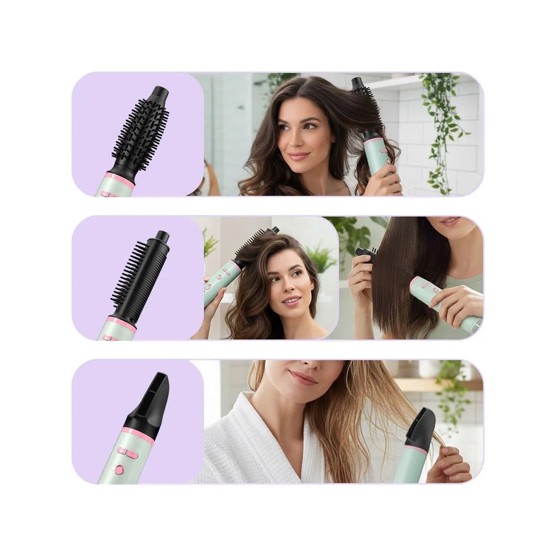 В комплекте 3 насадки. С концентратором поток воздуха становится сильнее и быстро сушит волосы. Расчёска – для создания прикорневого объёма и выпрямления. Вращающаяся насадка – для упругих и аккуратных локонов.