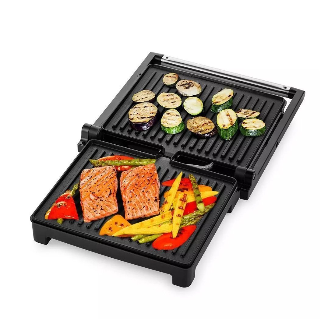 Конструкция гриля позволяет готовить в двух режимах. В двухстороннем режиме гриль закрывается крышкой, и продукты готовятся одновременно с двух сторон. В одностороннем режиме крышка гриля откидывается на 180°, и гриль превращается в большую жаровню.