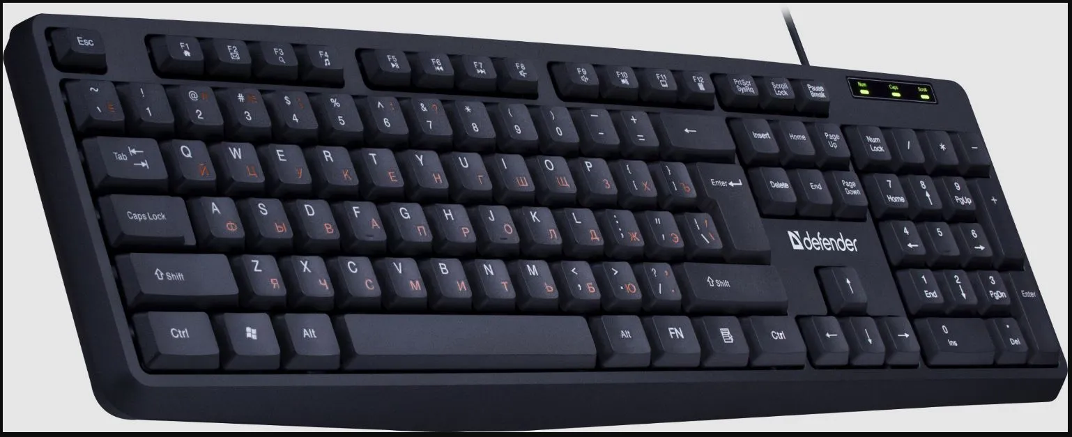 Тип товара - для офиса Тип клавиатуры - мембранная Тип подключения - проводной Интерфейс подключения - USB Количество дополнительных клавиш (функций) - 12 (+FN) Цвет языка основной раскладки - оранжевый Питание - 5 В / ⎓50 мА, от USB-порта Ребра жесткости - внутренние и внешние Резиновые ножки - да Длина кабеля - 1.8 ±5% м Цвет - чёрный Материал - Пластик Системные требования для ПК - Windows 2000/XP/Vista/7/8/10/11 Mac OS X10