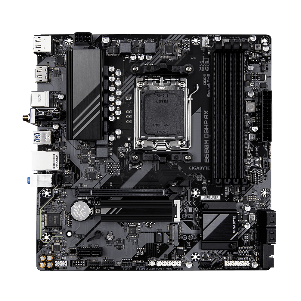 GIGABYTE B650M D3HP AX — функциональная материнская плата формата micro-ATX с сокетом AM5 и чипсетом AMD B650. Поддерживает память DDR5, интерфейс PCIe 4.0, оснащена двумя слотами M.2, видеовыходами HDMI и 2× DisplayPort, а также сетью 2.5G LAN и Wi-Fi. Отличный выбор для современных систем на базе AMD Ryzen.