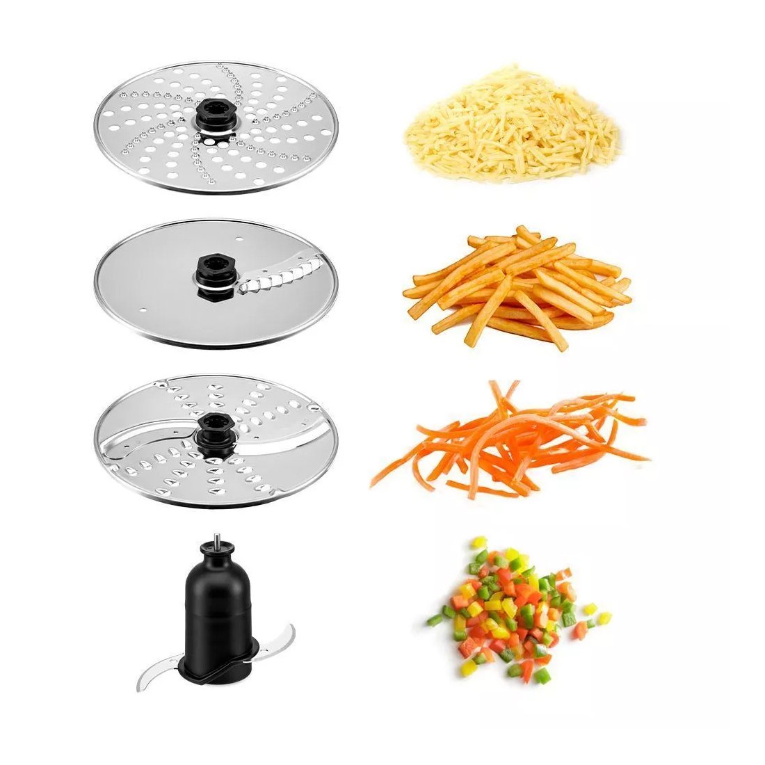 С установленными лезвиями комбайн работает как измельчитель. Он измельчает твёрдый сыр, травы, орехи. В комплекте также идут 3 диска: насадка с крупной тёркой/шинковка, насадка с мелкой тёркой и насадка для картофеля фри.
