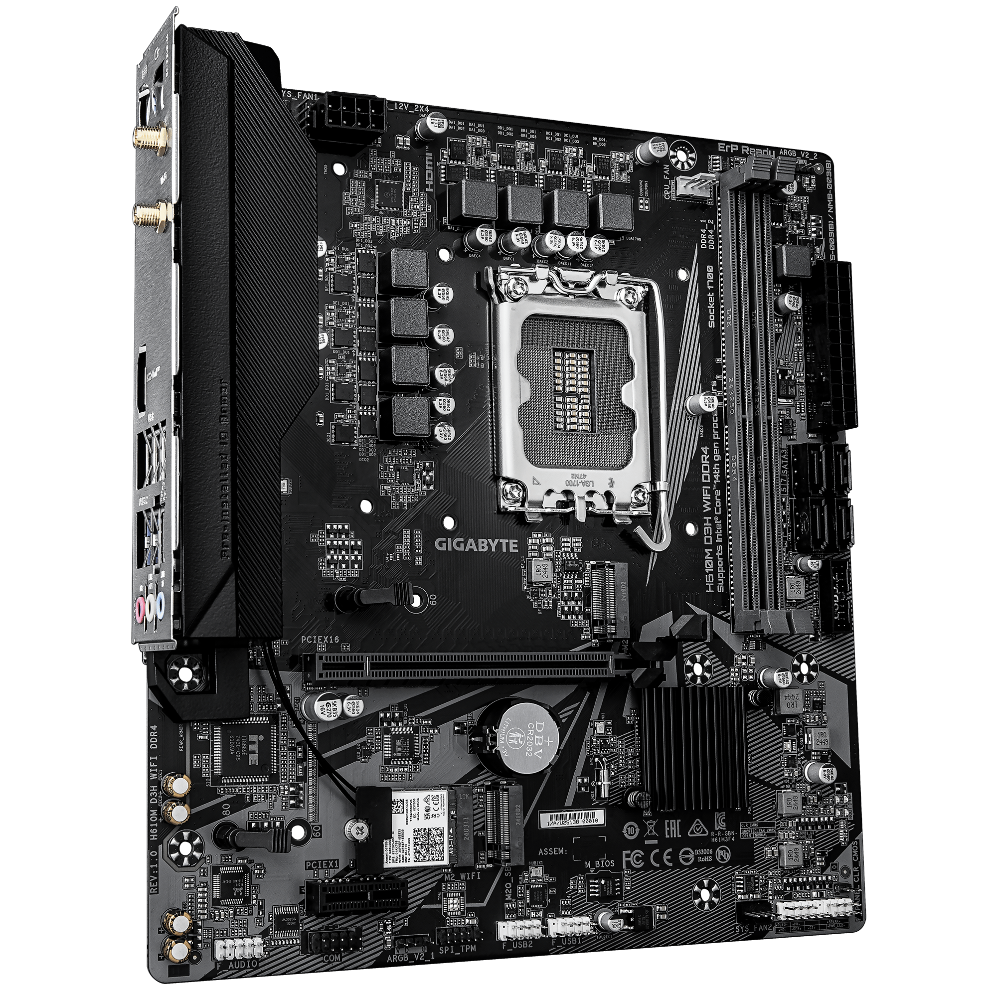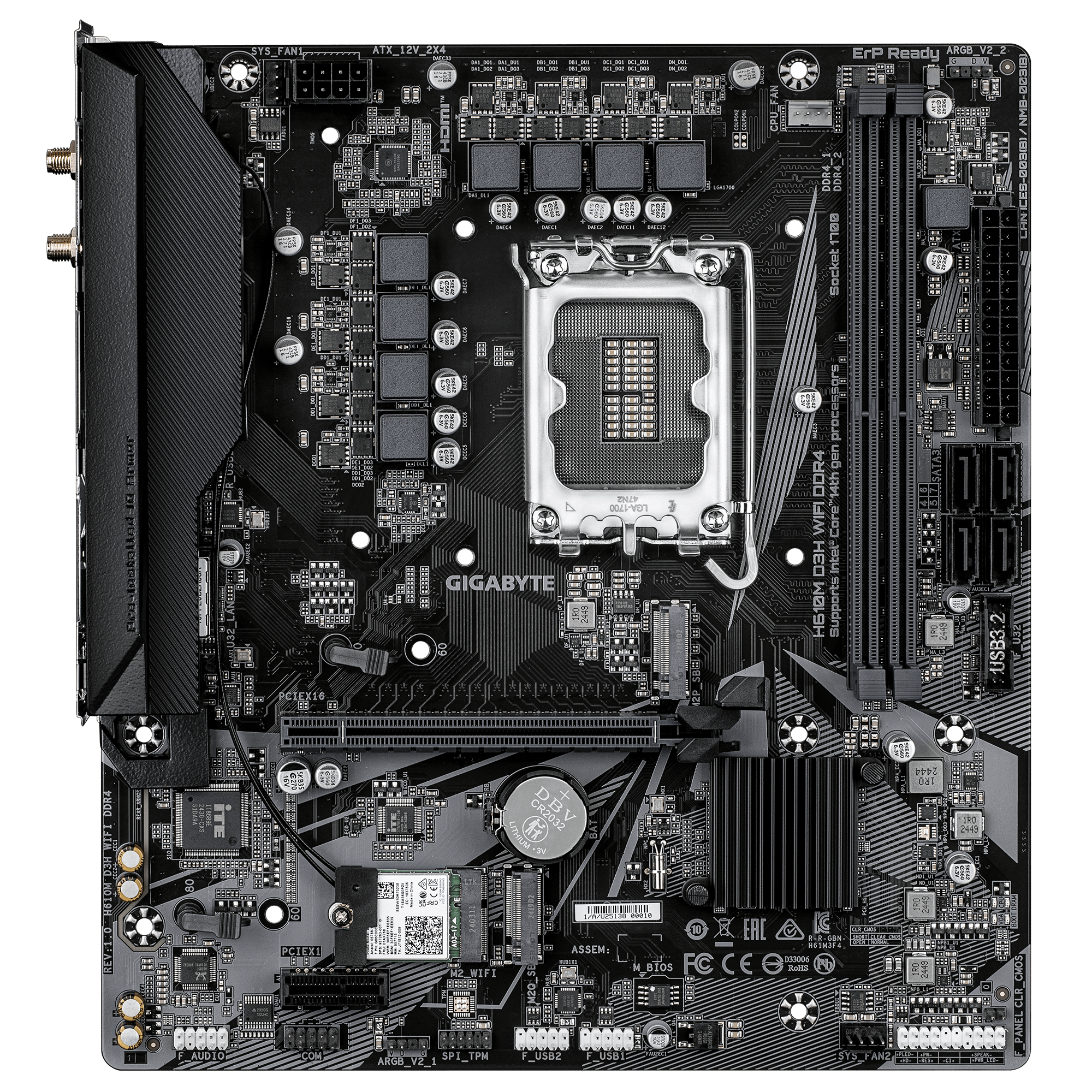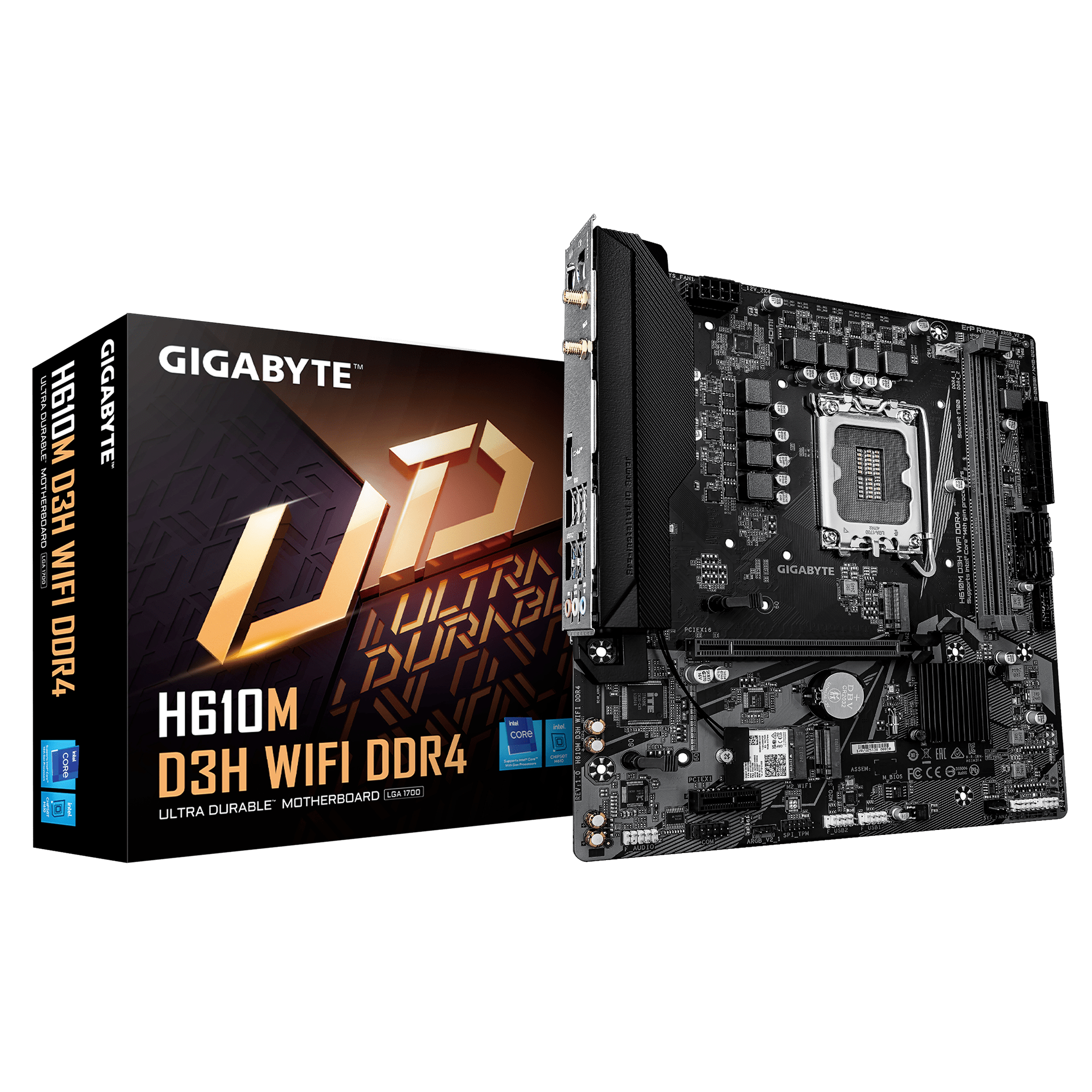 GIGABYTE H610M D3H WIFI DDR4 — доступная материнская плата формата micro‑ATX с сокетом LGA1700 и чипсетом Intel H610. Поддерживает память DDR4, оснащена интерфейсом PCIe 4.0, видеовыходом HDMI, двумя слотами M.2 и встроенным модулем Wi‑Fi. Отличный выбор для компактных домашних и офисных ПК на базе Intel Core.