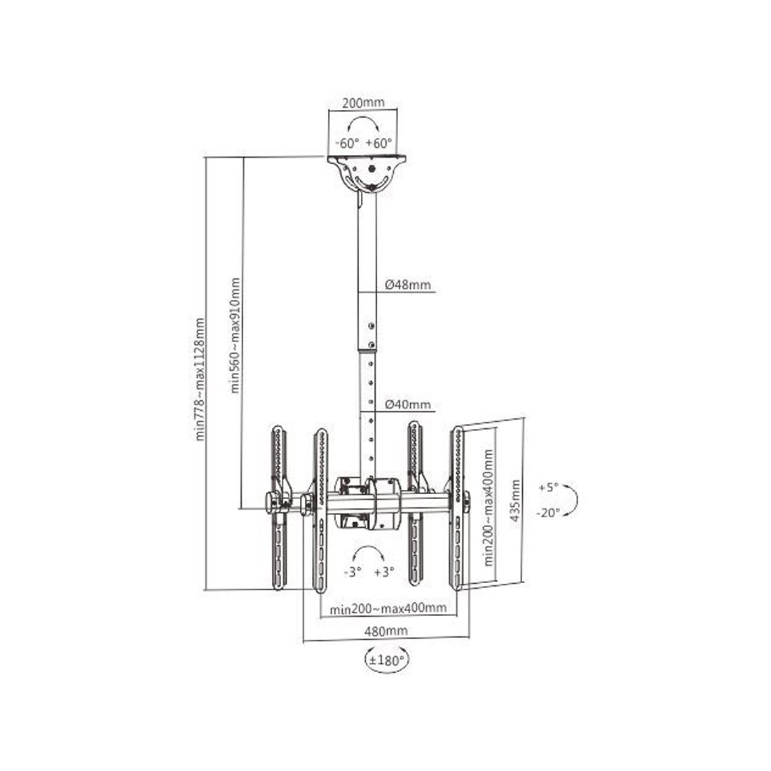 Данное потолочное крепление с возможностью полного перемещения, разработано для обеспечения максимальной универсальной совместимости. Наклонная потолочная пластина для плоских и наклонных потолко позволяет дисплеям наклоняться вниз и поворачиваться вокруг стойки без инструментов. Имеет регулируемую высоту для идеального позиционирования телевизора и канал управления проводами, чтобы кабели были скрыты и организованы.