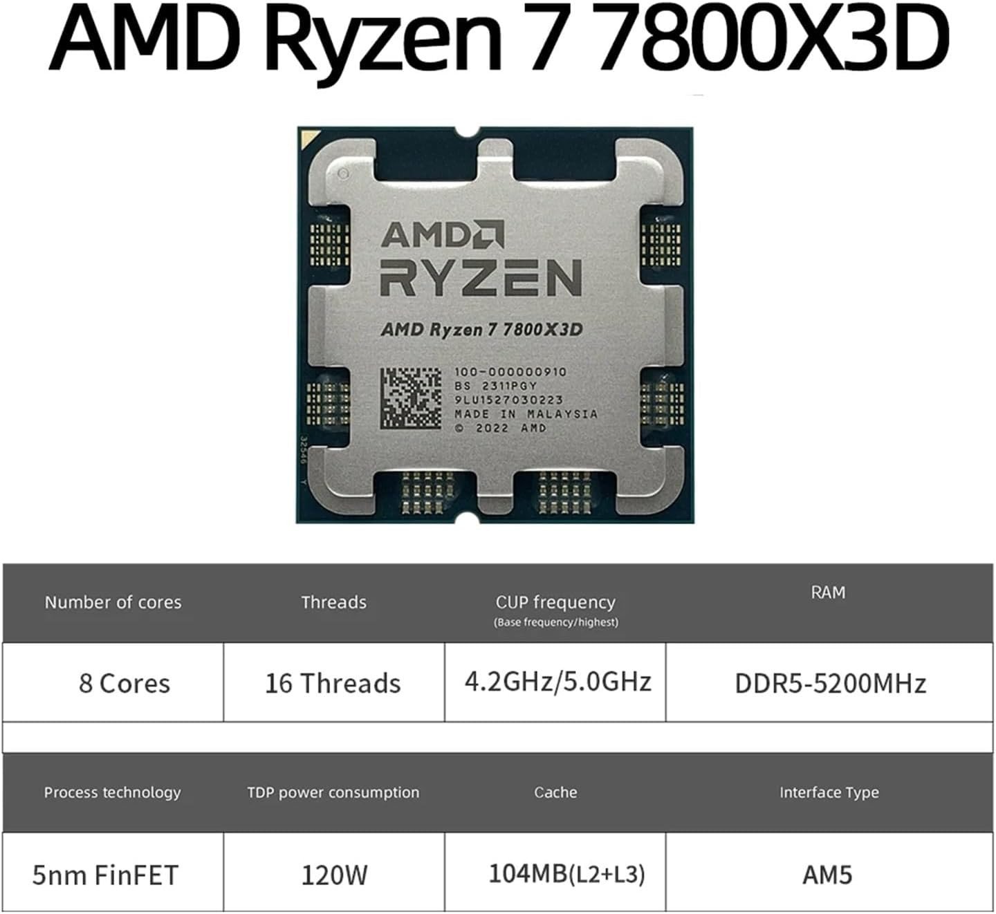 AMD Ryzen 7 7800X3D — высокопроизводительный процессор с 8 ядрами и 16 потоками, базовой частотой 4.2 ГГц и технологией 3D V-Cache (96 МБ L3). Построен на архитектуре Zen 4, поддерживает DDR5 и PCIe 5.0, обеспечивая максимальную производительность в играх и требовательных задачах.