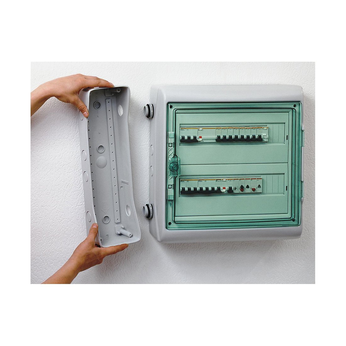 Этот защищенный от атмосферных воздействий щит Kaedra представляет собой щит для модульного устройства, устанавливаемый на поверхности. Состоит из 2 рядов по 18 модулей по 18 мм. Может применяться ко всем типам модульных распределительных устройств. Степень защиты IP - 65. Этот щит предназначен для водонепроницаемой установки внутри или снаружи помещений. Он оснащен прозрачной зеленой дверью. Цвет корпуса - светло-серый (RAL 7035). Он предназначен для установки в жилых домах, небольших зданиях и на промышленных объектах. Кабели могут быть введены сверху или снизу шкафа.