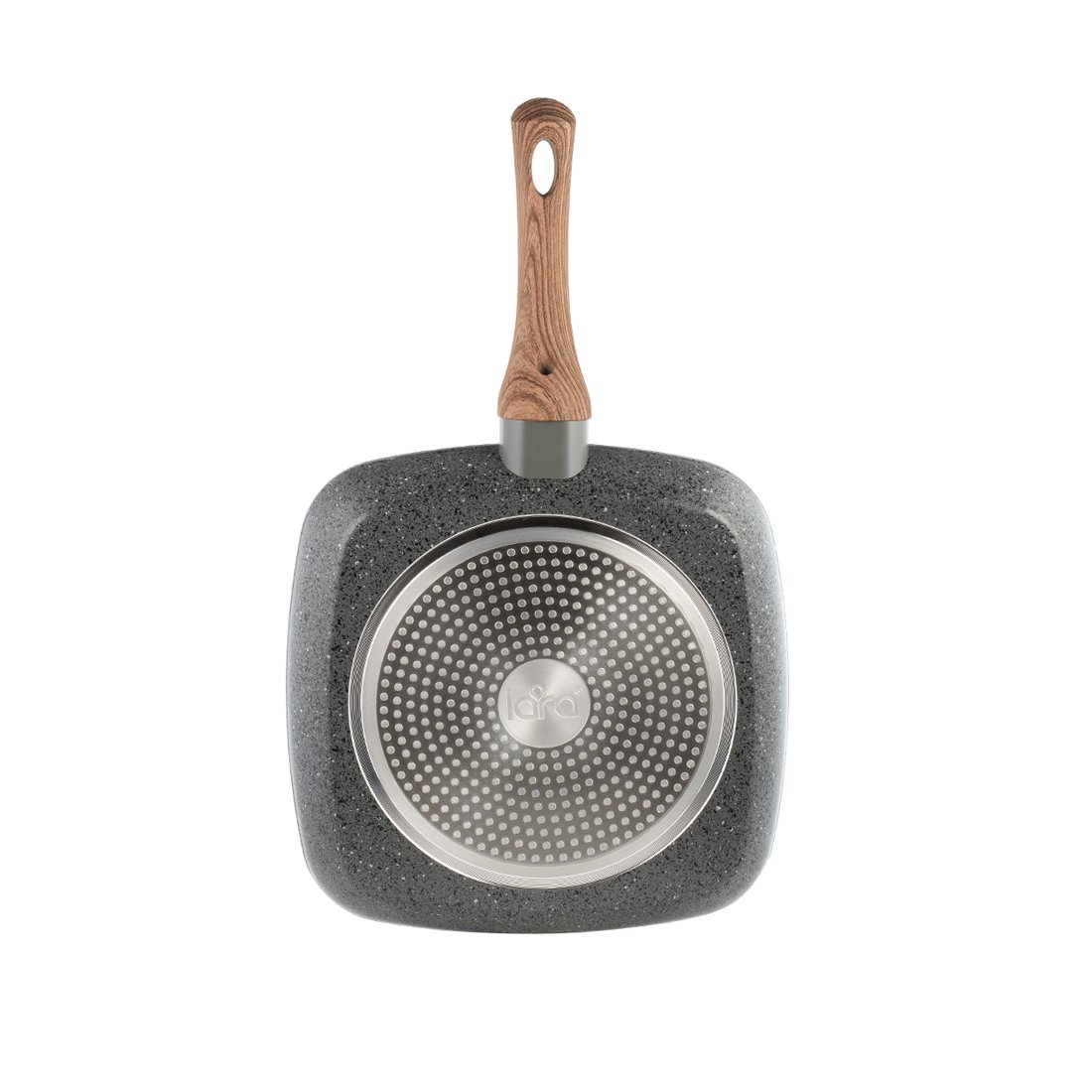 Сковорода-гриль LARA серии «Palermo» – это удивительное сочетание превосходного качества и внешней элегантности. Устойчивое к царапинам прочное внутреннее трехслойное и внешнее двухслойное антипригарное покрытие GRANIT с мраморной крошкой обеспечит длительную эксплуатацию. Для производства были подобраны экологически чистые материалы.