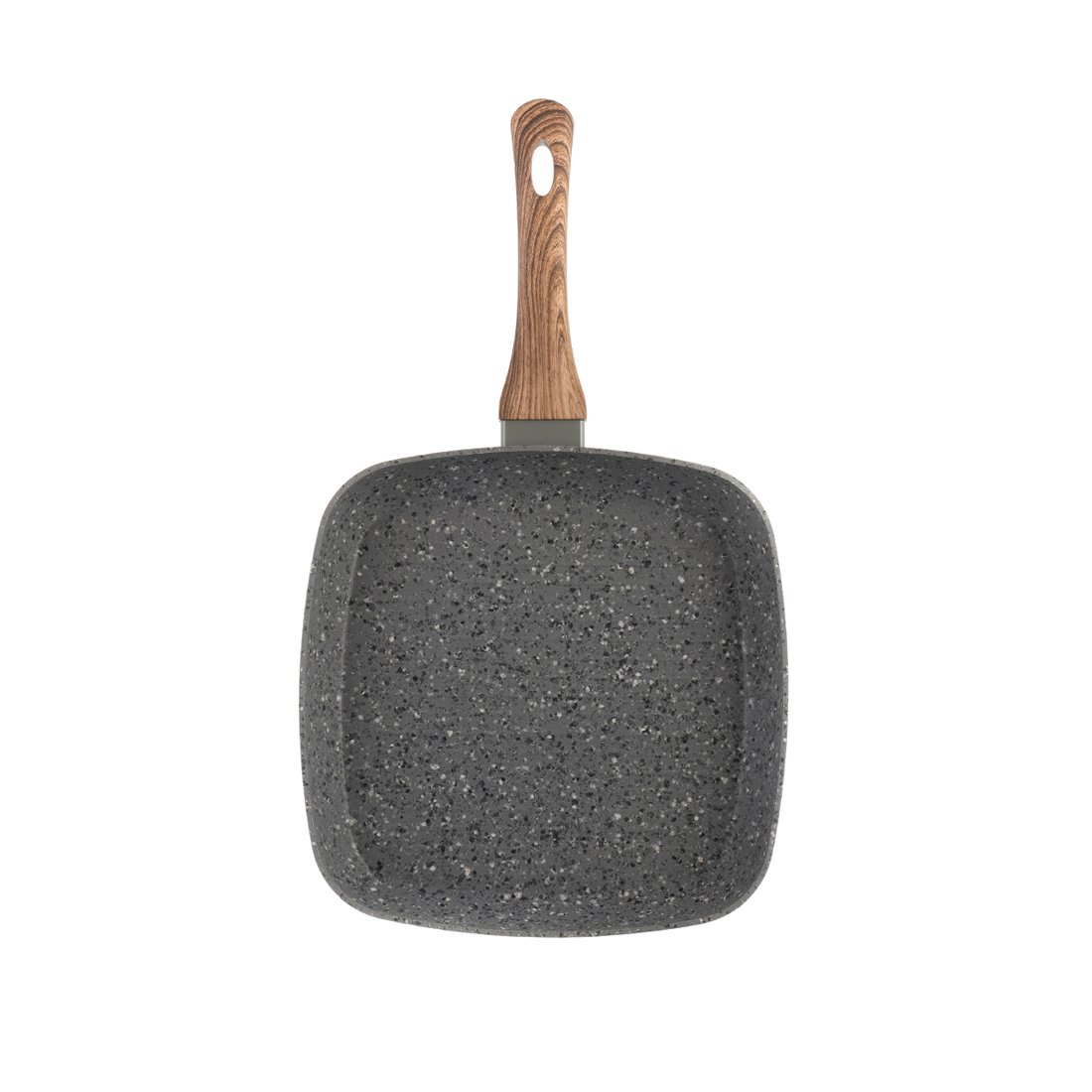 Квадратный корпус выполнен из кованого алюминия и имеет отличные теплопроводные свойства. Эргономичная ручка с широким хватом выполнена из бакелита с покрытием Soft-Touch и отделкой под дерево. Стальное точечное индукционное дно подходит ко всем типам плит.