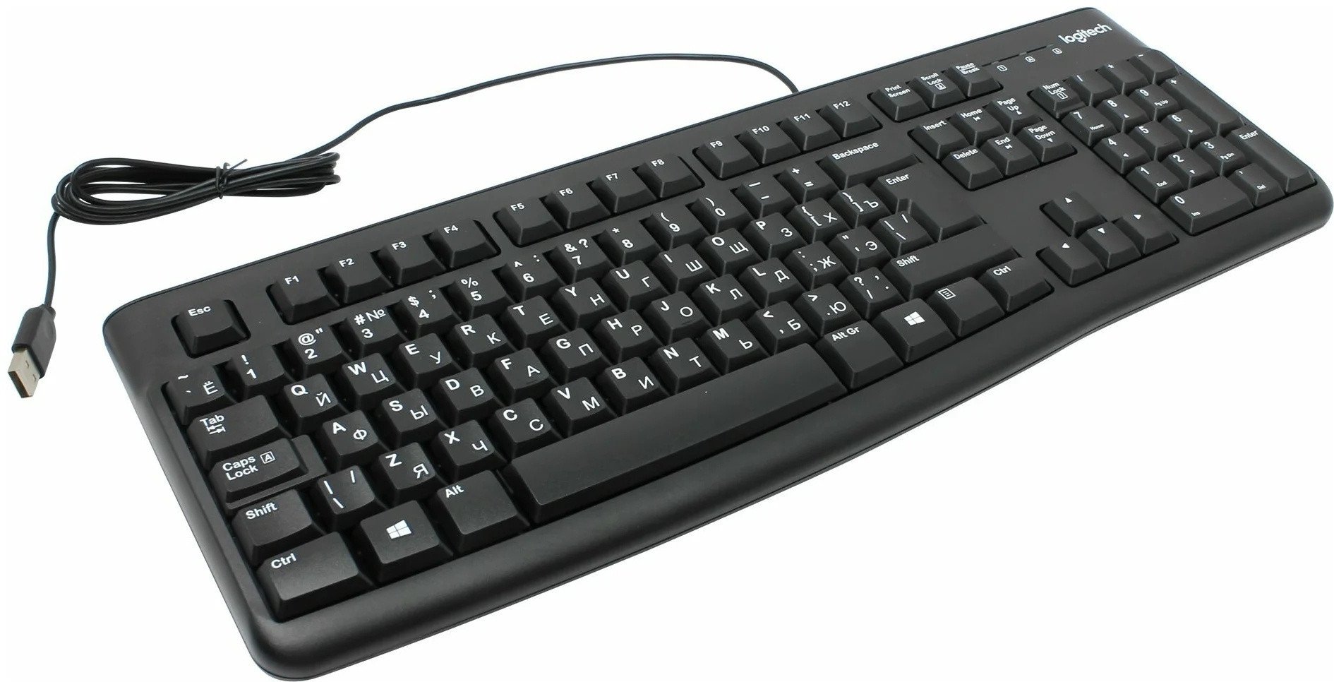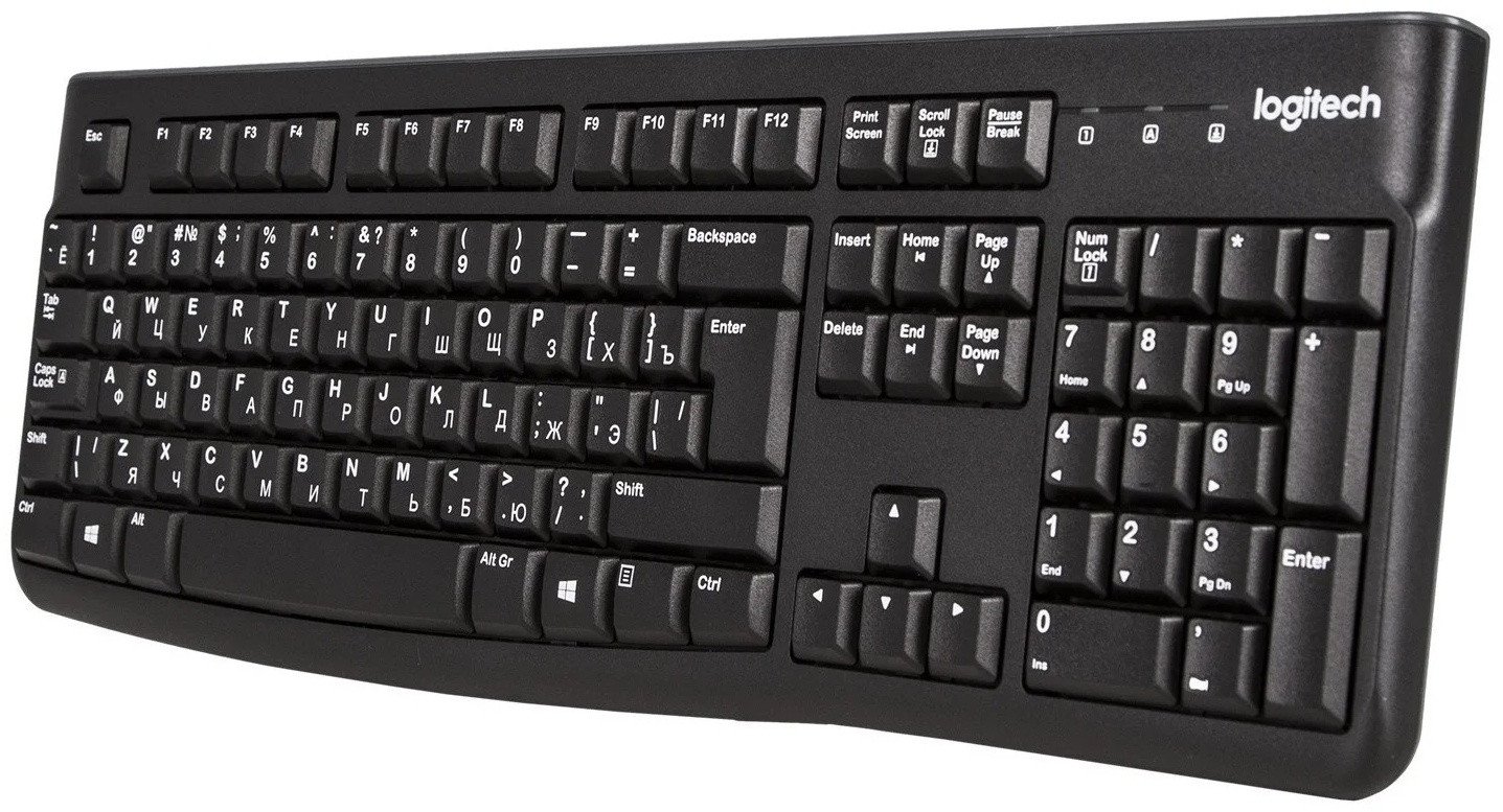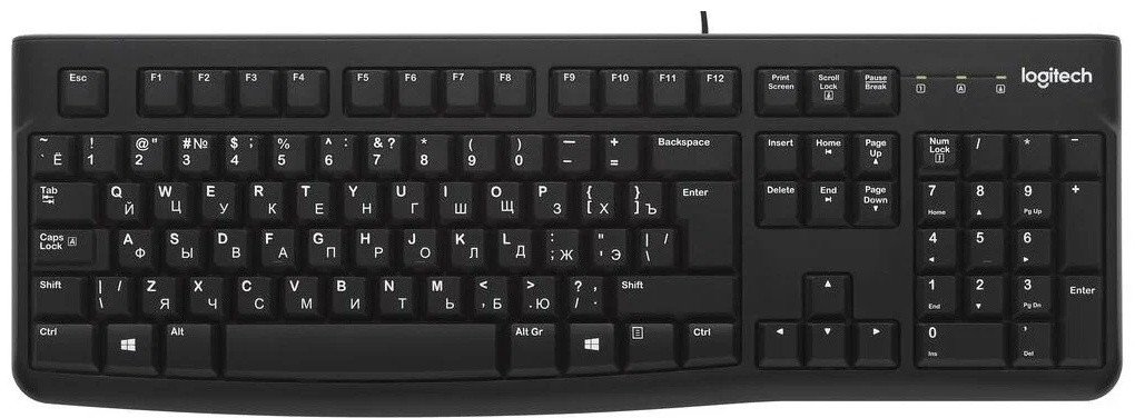 Logitech K120 — надёжная проводная клавиатура с 105 клавишами, полноразмерной раскладкой и цифровым блоком. Подключается через USB, поддерживает EN/RU раскладку и обеспечивает стабильную работу без драйверов.