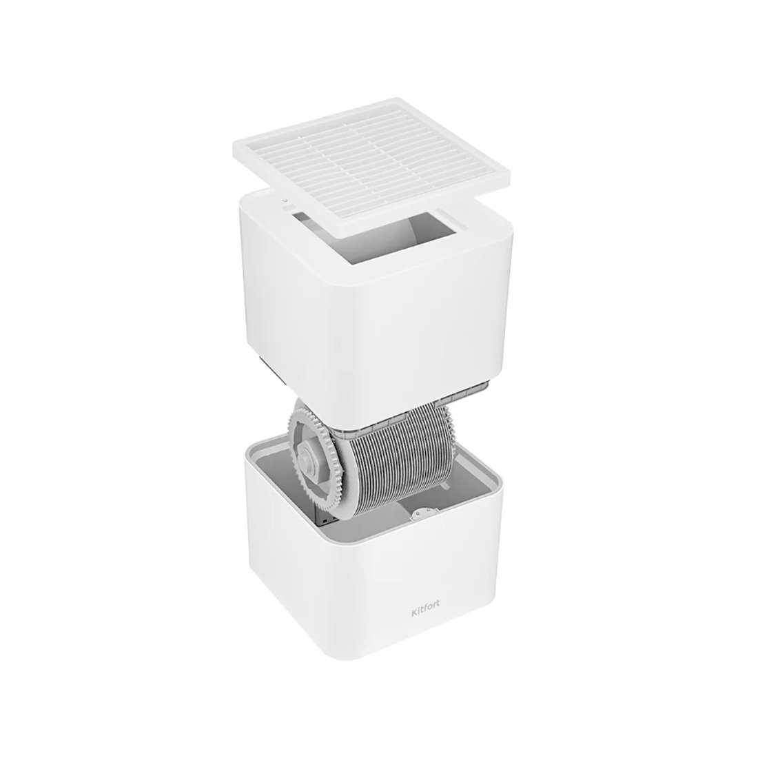 Принцип работы таков: воздух, поступающий в прибор, проходит через испарительный барабан, погруженный в воду. Пыль, микрочастицы и примеси удерживаются на испарительном барабане и затем оседают в резервуаре с водой, а воздух выходит чистым и увлажнённым.