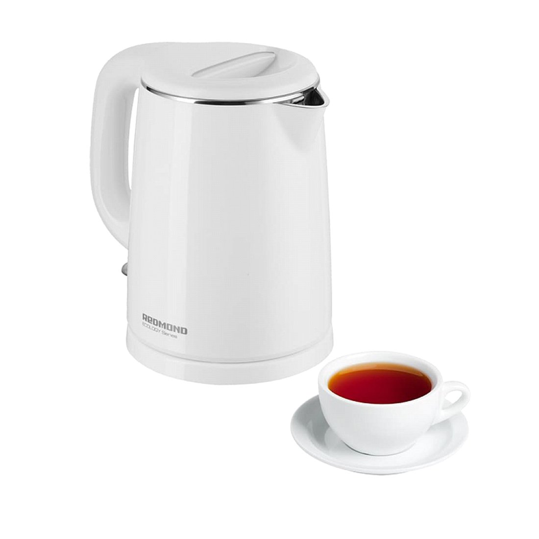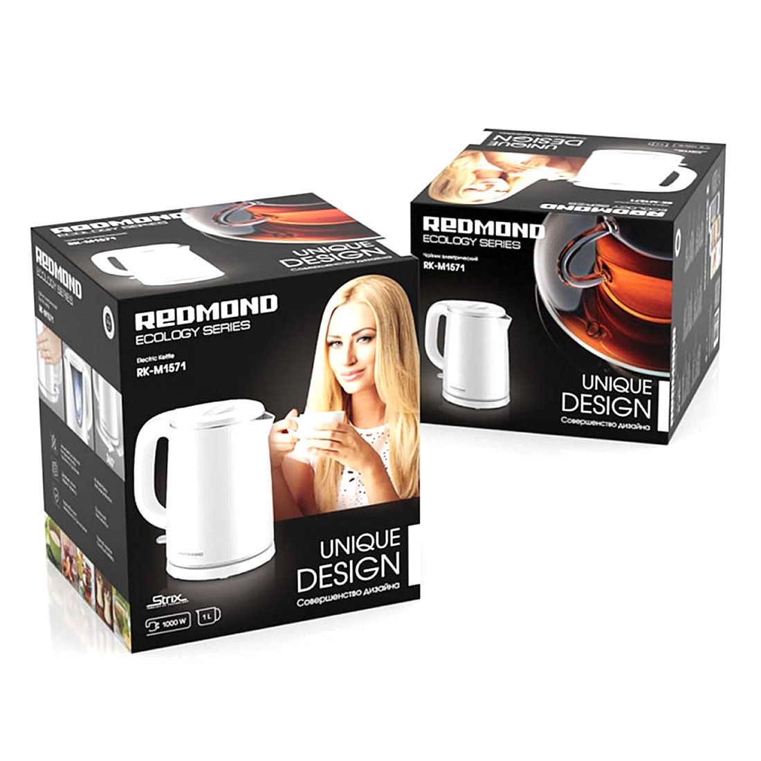 Чайник выполнен из нержавеющей стали и пластика. Устройство быстро вскипятит или подогреет воду благодаря нагревательному элементу мощностью 1000 Вт. Компактный электрочайник REDMOND M1571: