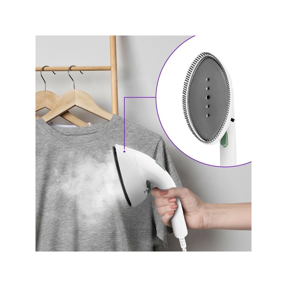 Отпариватель имеет небольшой корпус и удлинительные трубки, которые позволяют настроить удобную высоту устройства. Утюжок закрепляется в держателе между трубками. Корпус оснащён колёсиками для перемещения. Длина парового шланга — 1,4 метра.