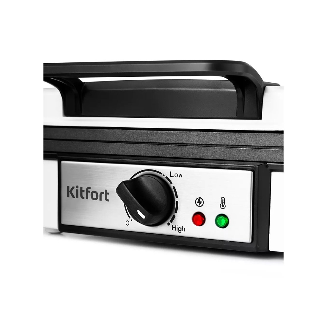 Вафельница оснащена индикатором питания, термостатом для поддержания постоянной температуры поверхностей и индикатором, показывающим включение и отключение нагрева.