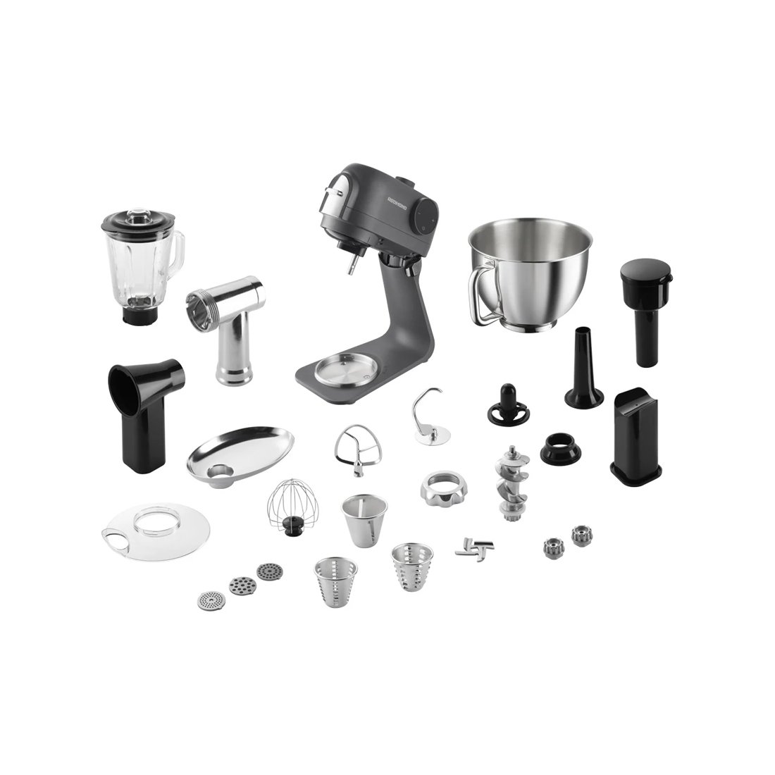 Кухонная машина Redmond FM615 мощностью 1800 Вт комплектуется 12 насадками. Они служат для взбивания ингредиентов, замешивания теста, нарезки овощей, а также приготовления колбас, сосисок, кеббе. Сенсорная панель открывает доступ к 7 скоростям и остальному функционалу.