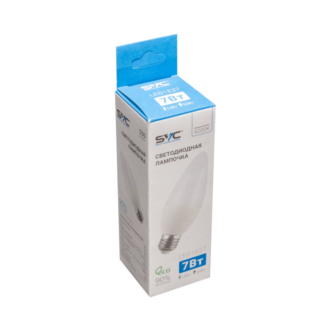 Светодиодная лампа SVC LED C35-7W-E27-4200K энергосберегающая лампа, выполненная на основе ярких и долговечных светодиодов с высокой светоотдачей, создает поток нейтрально-белого, не раздражающего глаз света с цветовой температурой 4200K. Она оптимально подходит для освещения жилых/офисных помещений и позволяет значительно сократить расходы на электроэнергию. Лампа не требует утилизации и имеет диапозон рабочих температур от -50 до +50 °C