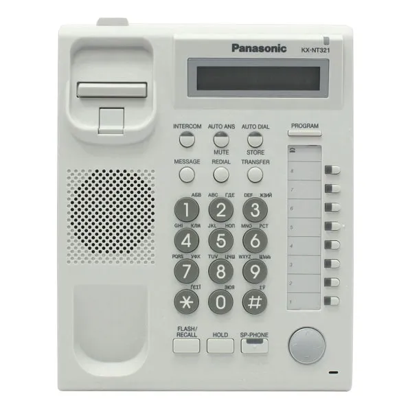 Panasonic KX-NT321RU — это системный IP-телефон, предназначенный для интеграции с IP-АТС Panasonic серии TDE, NCP и TDA (с версией ПО 5.00 и выше).Он оснащён 1-строчным ЖК-дисплеем с подсветкой и поддержкой кириллицы, что обеспечивает удобное отображение информации.Телефон имеет 8 программируемых кнопок с двухцветной индикацией, позволяющих настраивать быстрый доступ к часто используемым функциям.Наличие спикерфона (громкой связи) и 20 мелодий звонка делает его удобным инструментом для деловых переговоров.Подключение к локальной сети осуществляется через Ethernet-порт, поддерживающий Power over Ethernet (PoE), что упрощает установку и снижает потребность в дополнительных источниках питания.Также предусмотрен разъём для подключения проводной гарнитуры, что расширяет возможности использования устройства.Телефон поддерживает возможность установки на столе или на стене, что предоставляет гибкость в размещении устройства.